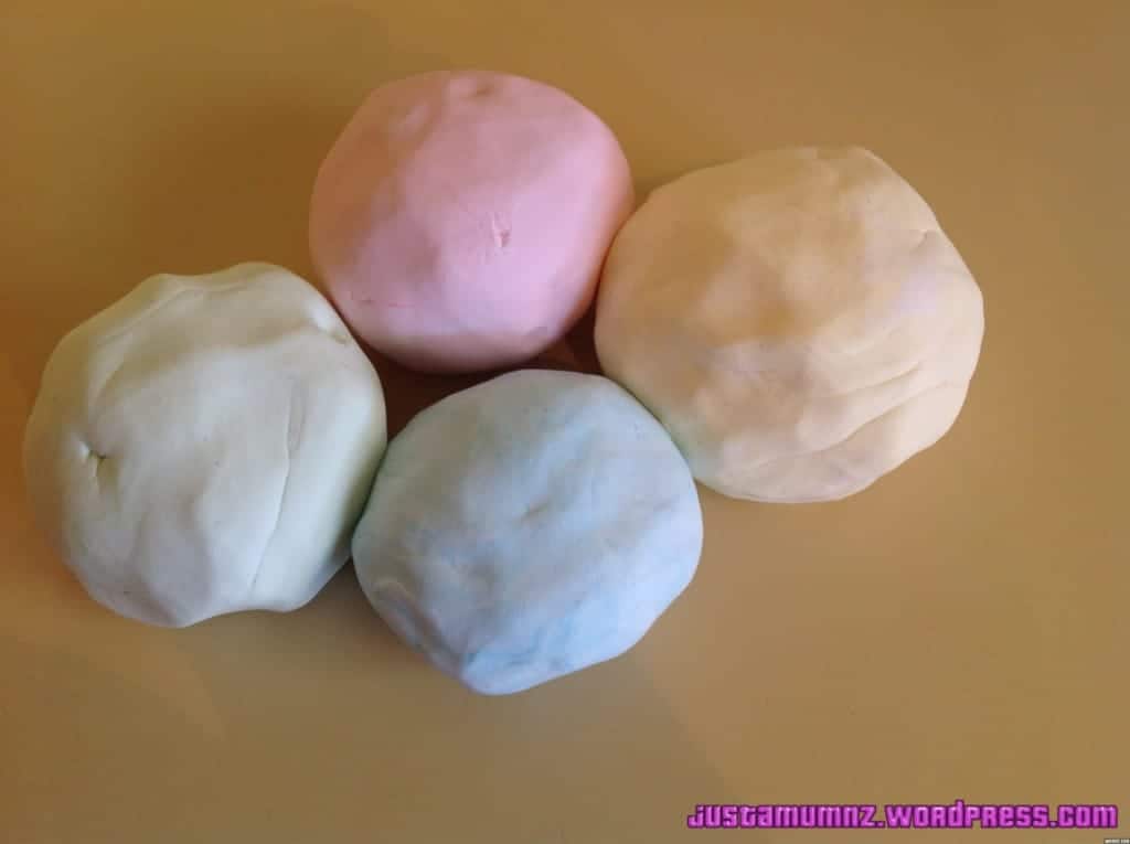 I made one large batch of the original and then kneaded in different colours to small portions of it – and the kids loved playing with it – its so soft, light and a really delightful texture to work it.