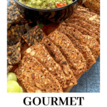 These crackers are twice cooked, once into a loaf shape, then sliced thinly to become the crisp golden gourmet crackers that I love. They are also really versatile. Once you have the basic recipe down the additions you make in the way of herbs dried fruits and nuts can vary.
